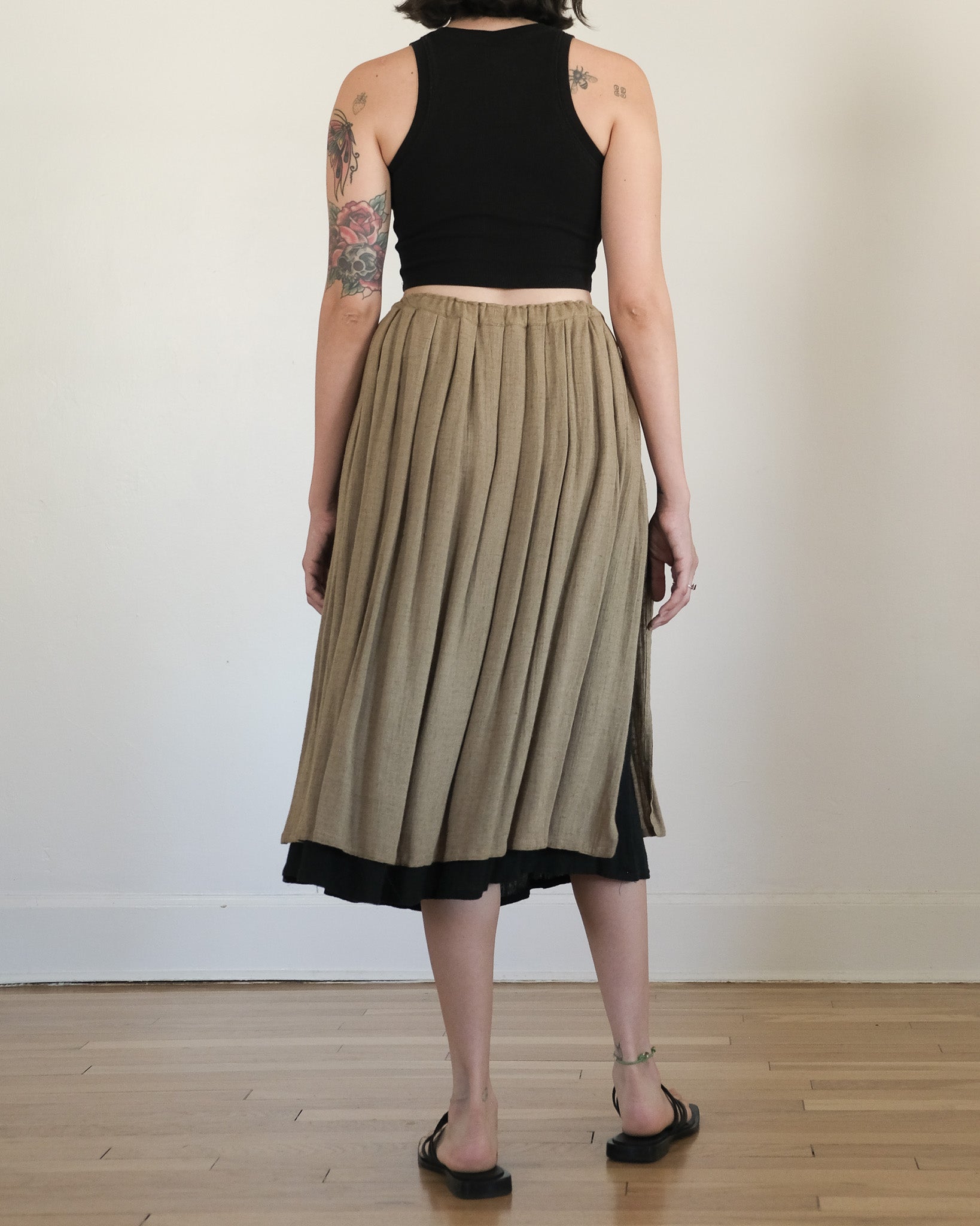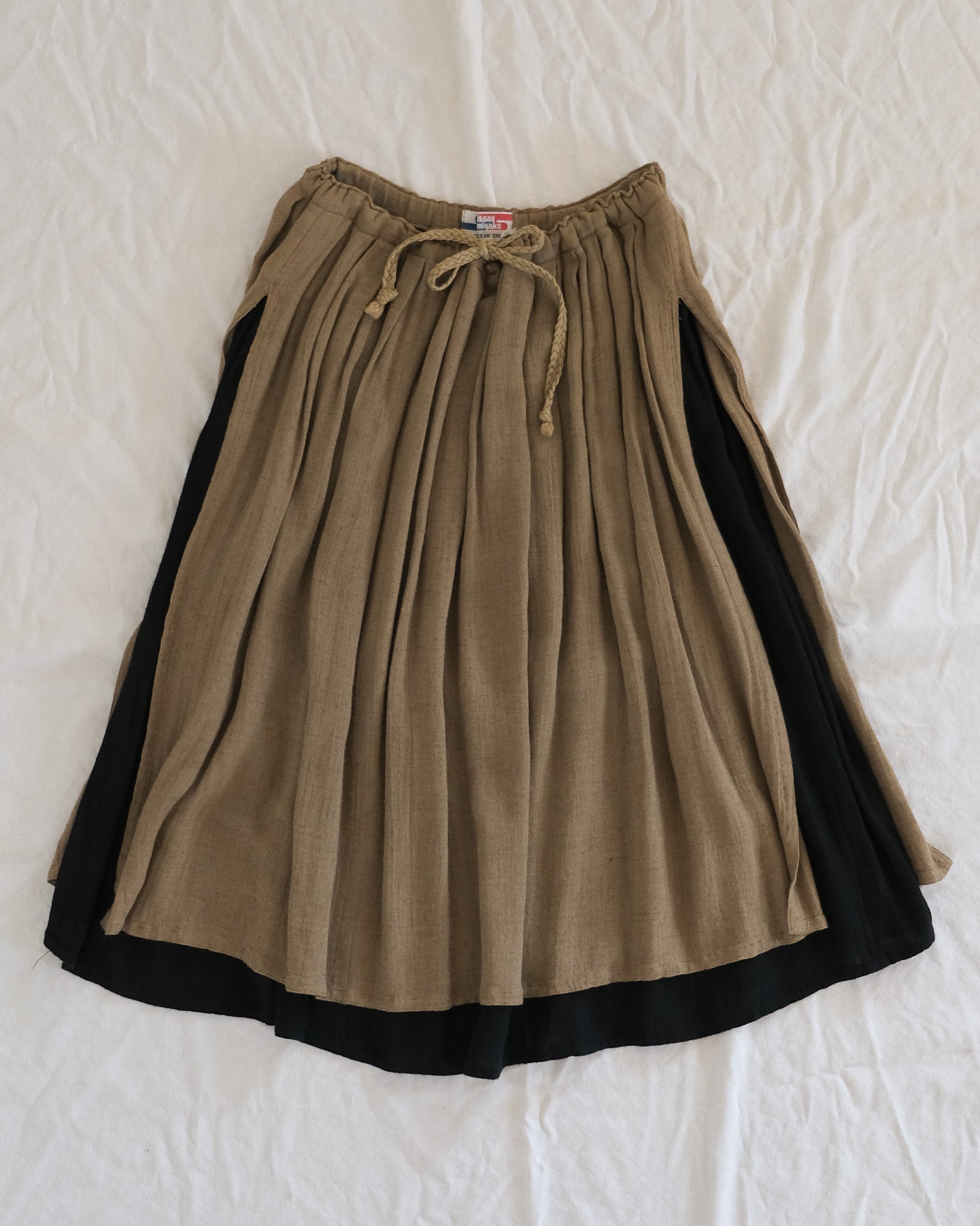Rare double-layered drawstring skirt c. 1970s Issey Miyake. Acquired from the private collection of a retired art dealer. Soft and gauzy, black and tan linen (or linen blend) fabric. Drawstring waist with braided jute self-tying belt. Layered construction with slits at side on top.