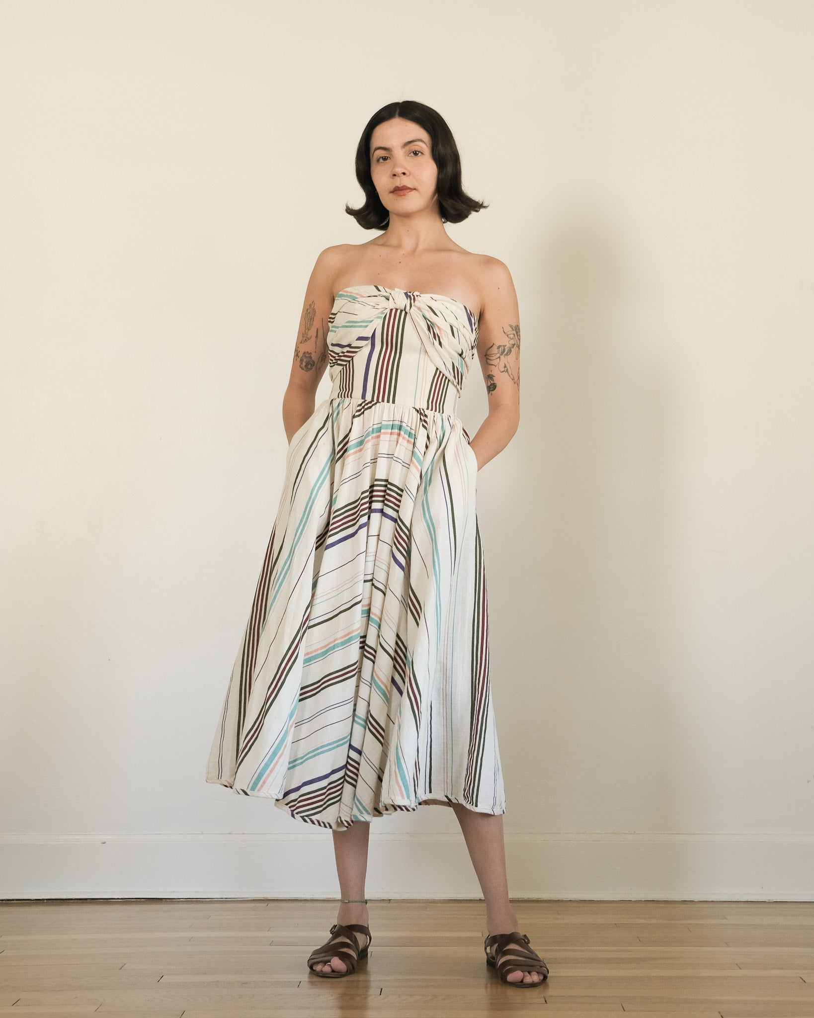 Multi-colored striped halter dress c. 1980s Barboglio. 100% cotton - midweight gauzy fabric in the coolest striped palette. Fitted bodice ruched overlay, and halter strap that can be tucked in for a strapless look. Full, midi length skirt with slip pockets at waist. Zipper closure at back.