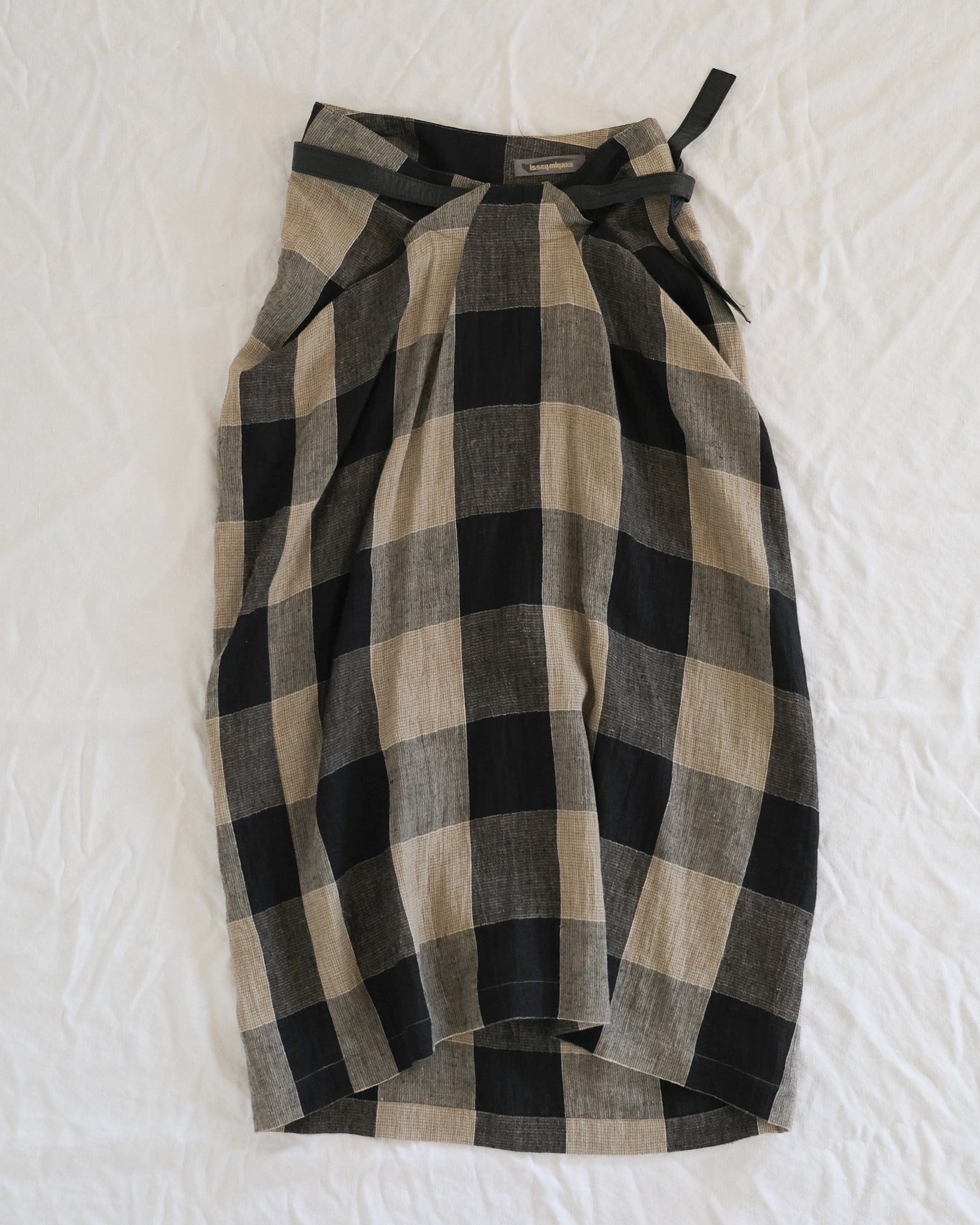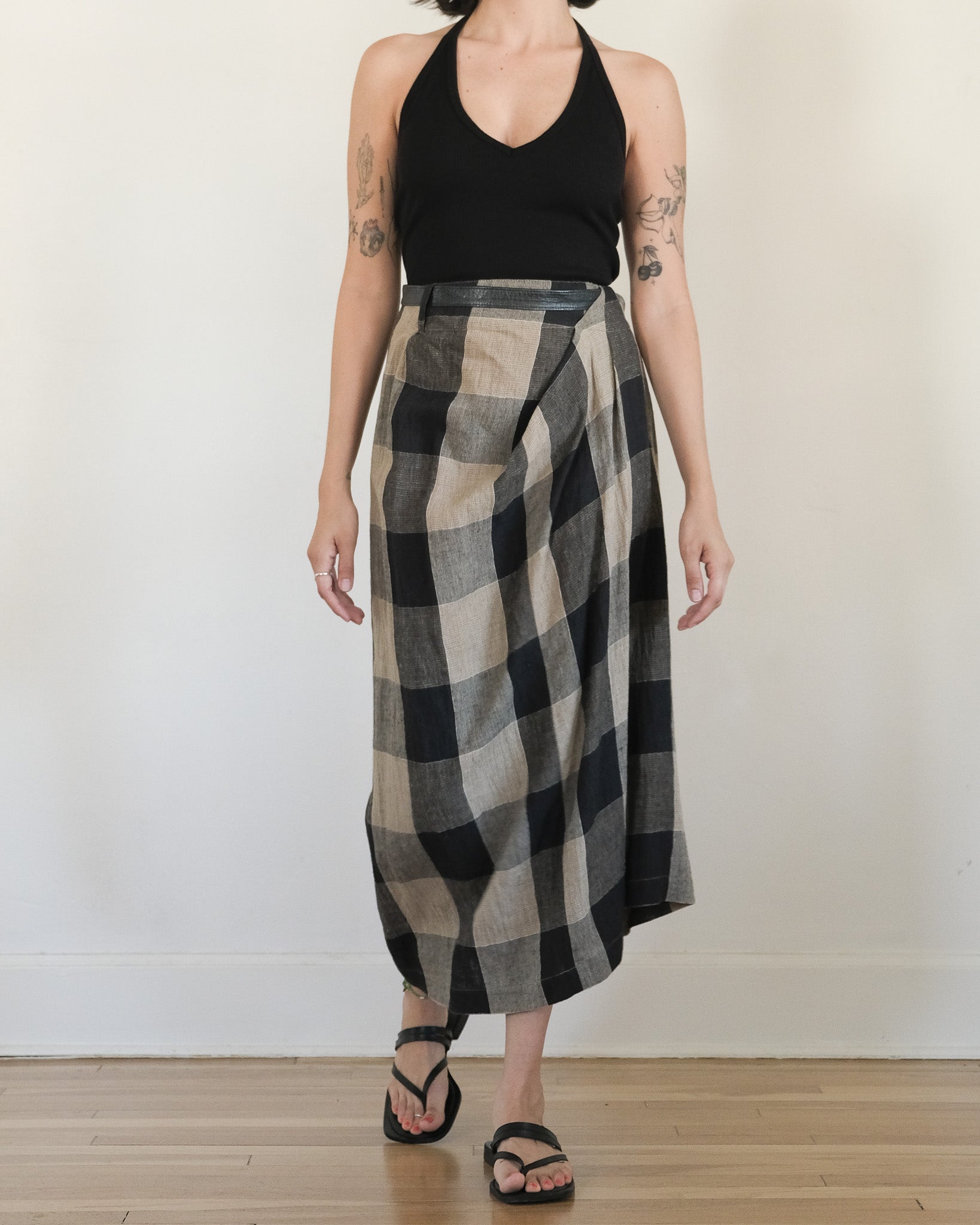Tan and black oversized check midi skirt c. 1980s Issey Miyake. Acquired from the private collection of a retired art dealer. Unlined and lightweight natural fiber (feels like linen or linen + cotton blend). Detachable self-tying black leather belt. Architectural draping with pleating near waistline. Zipper and button closure at back.