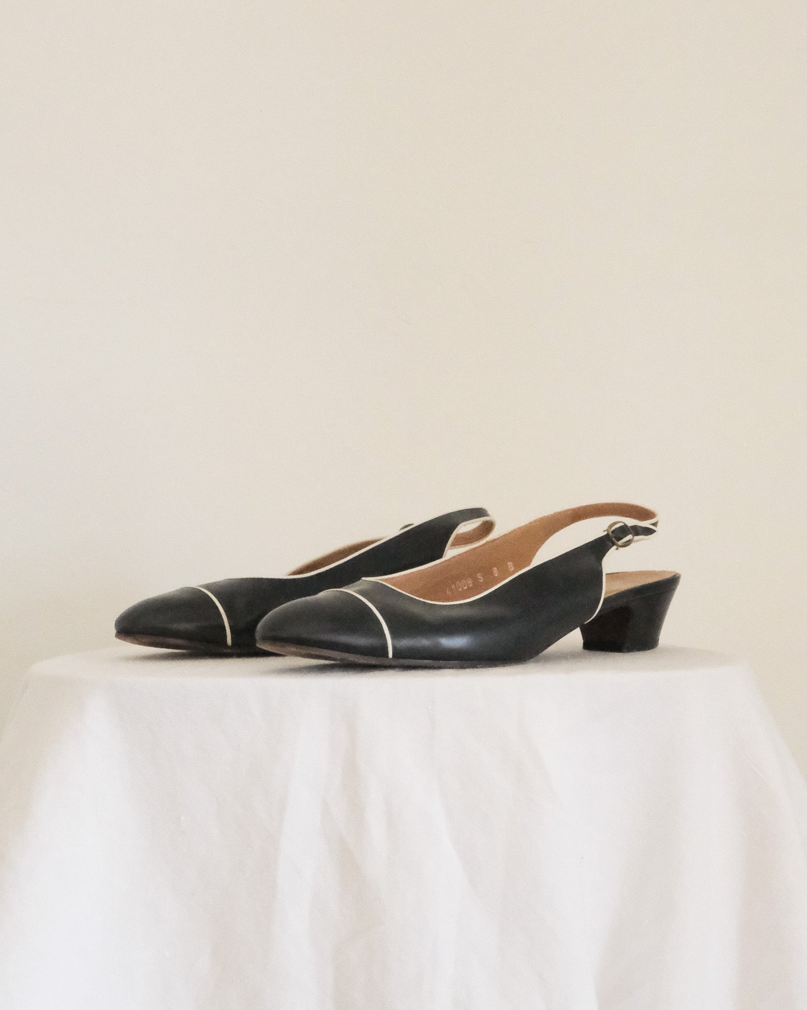 Deep navy blue slingback pumps c. 1980s Ralph Lauren. 100% leather. Deep blue, almost black leather with white contrast piping. Rounded toe. 1.5 inch heel. Adjustable buckle closure.
