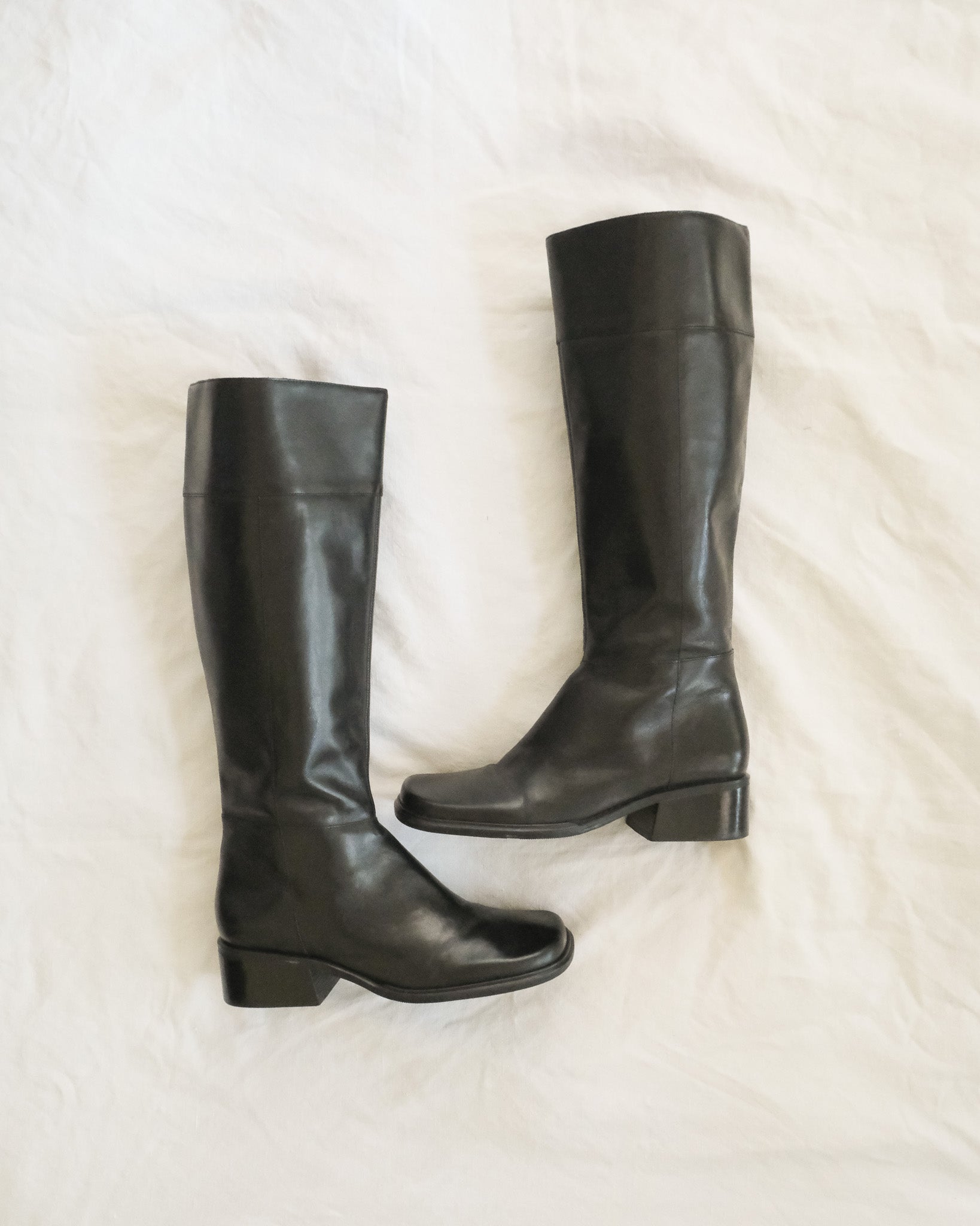 Black leather knee high boots c. 1990s/y2k. Leather upper, man made sole. Square toe. 1.5" block heel. Zipper closure at inner calf, with elasticized tab at calf.