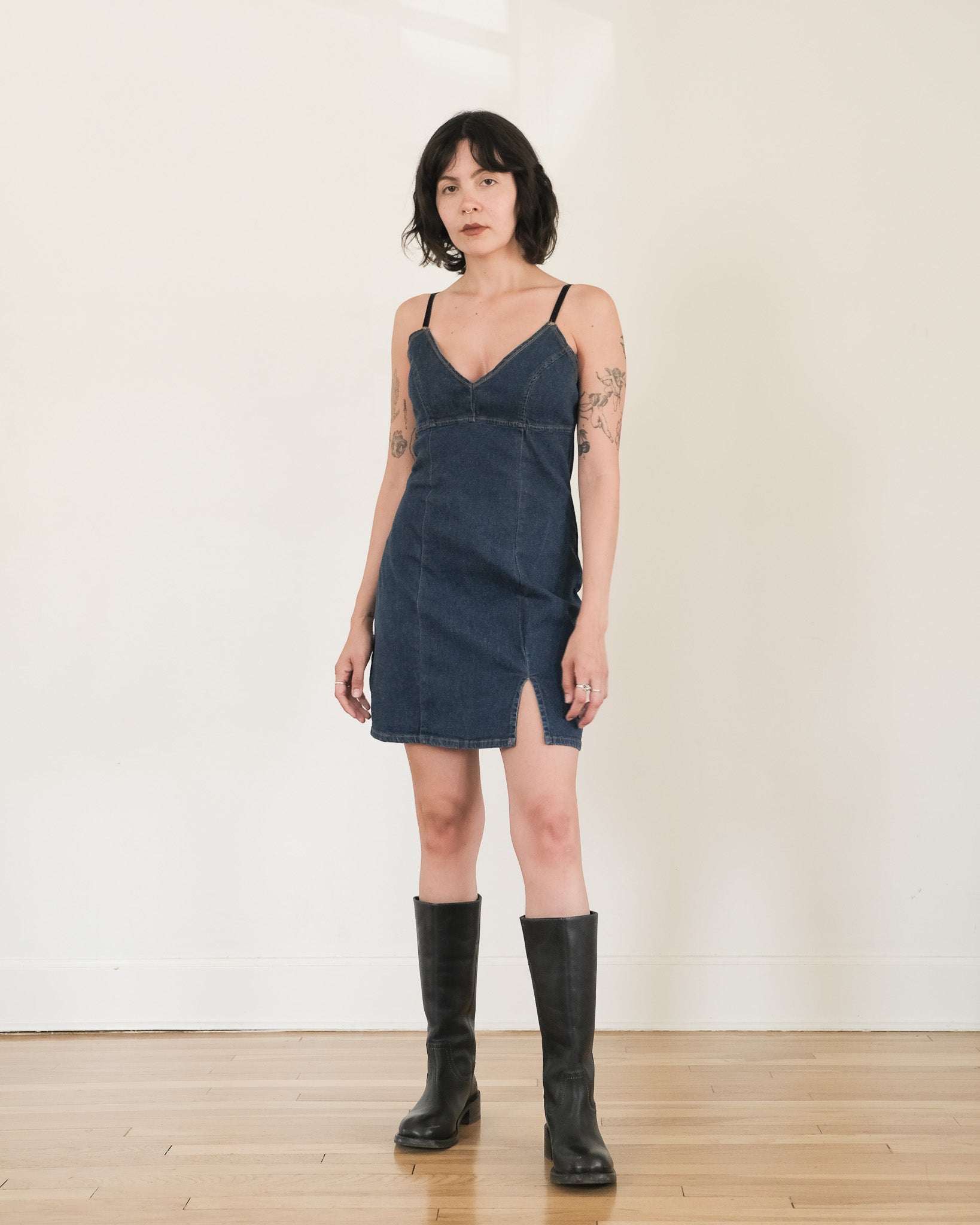 Dark denim mini dress c. 1990s. Stretchy cotton + spandex blend. Adjustable elastic spaghetti straps. V neckline. Form-fitting. Small slit at left hemline.