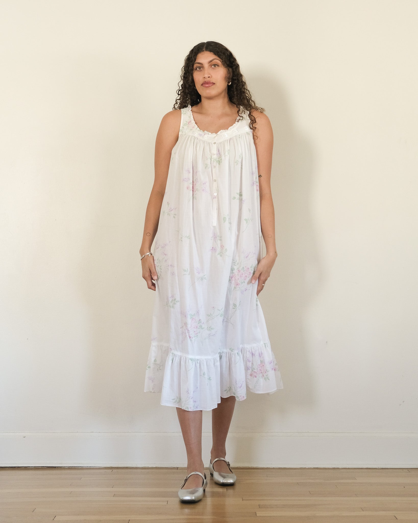 White floral motif nightgown - 1994 Eileen West. 100% cotton with pink, purple, and green floral motif. Sleeveless construction with ruffle-trimmed scooped neckline. Gathered at yoke, with satin ribbon. Mother of pearl button down center to waist. Relaxed silhouette. Single tier ruffled hemline, falls mid-calf.