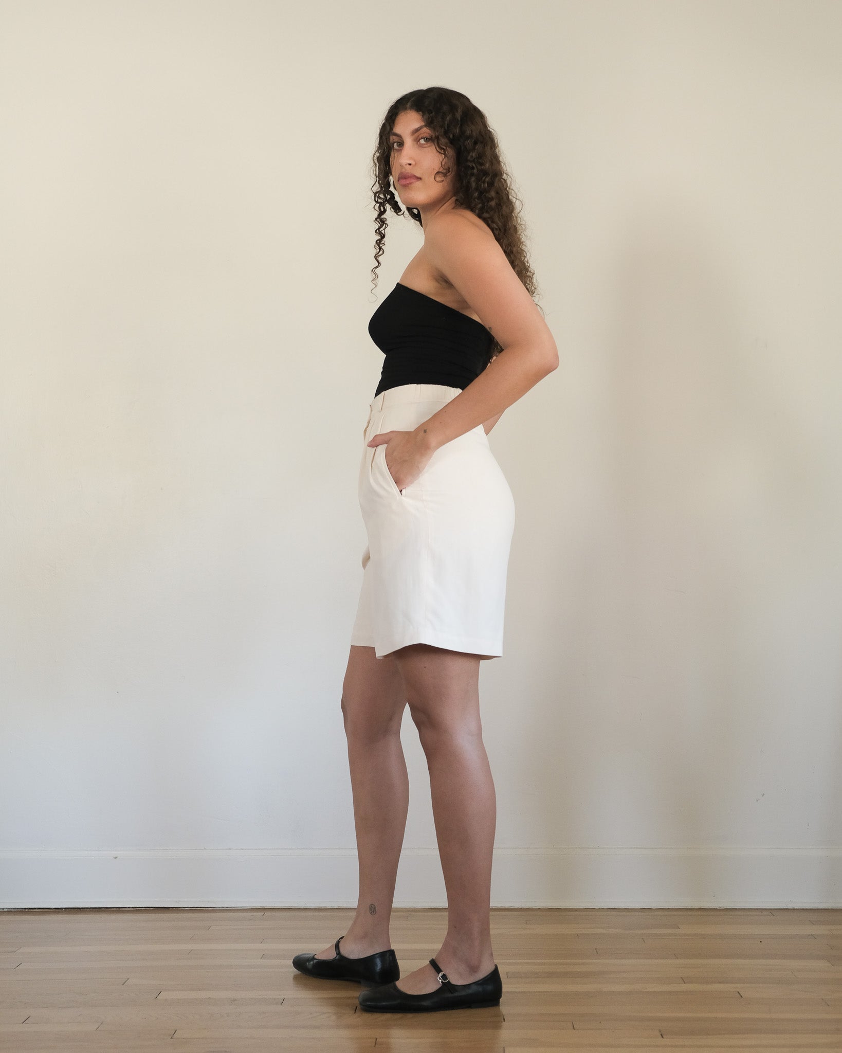 Cream silk pleated shorts c. 1990s Liz Claiborne. Fully lined 100% silk. Pleated at front with slip pockets at hips. Elasticized back waistband with belt loops. High rise with zipper fly. Hemline falls mid-thigh.