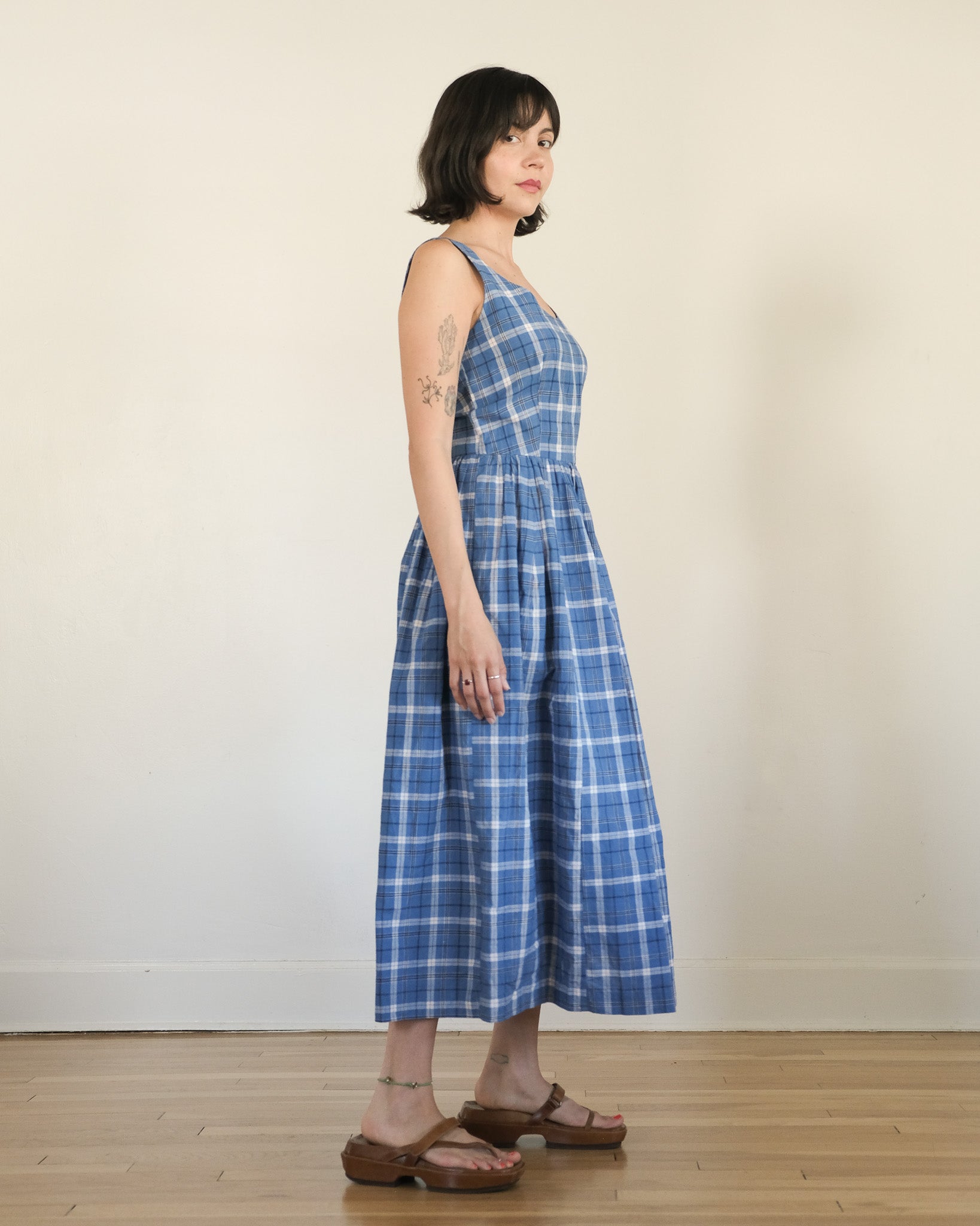 Blue plaid midi dress c. 1990s Ralph Lauren blue label. 100% cotton madras, unlined. Fitted, sleeveless bodice with scooped neckline and back. Gathered at the waist, with a full skirt. Slip pockets at hips. Full button-back closure. Hemline falls mid-calf.