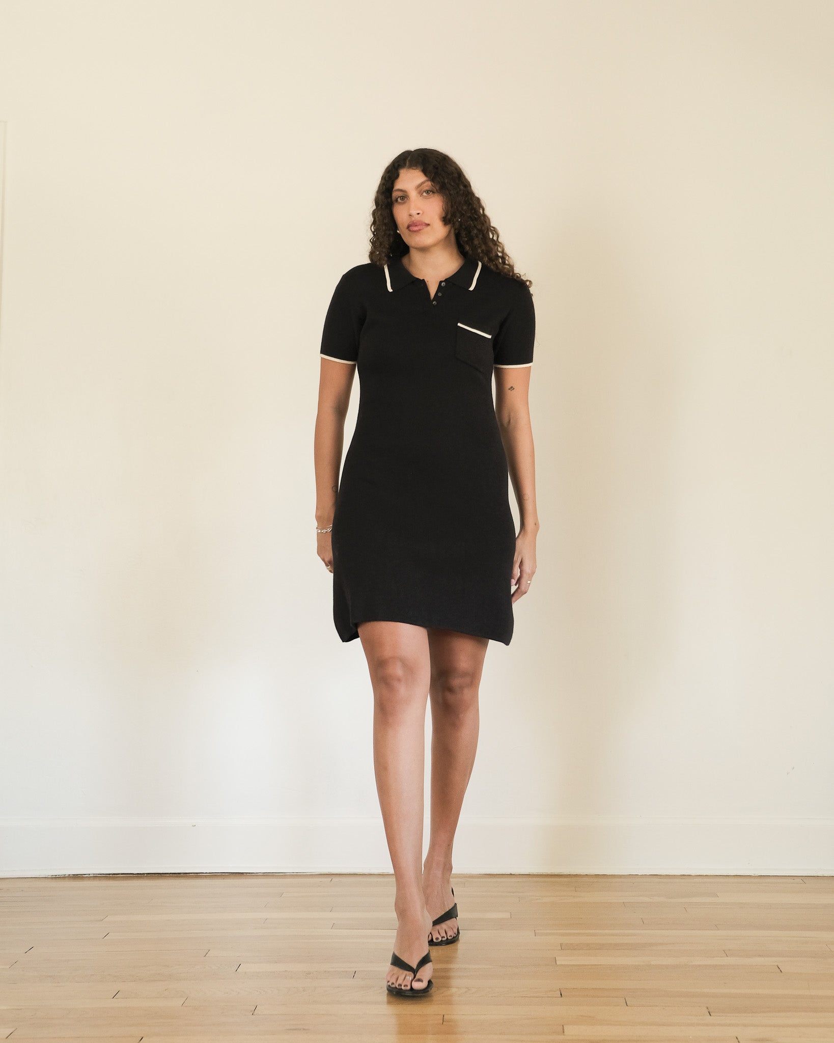 Black ribbed knit polo mini dress c. 1990s. Thick and stretchy knit cotton + rayon blend. Short sleeves and a collared neckline with 3 button closure. Patch pocket at breast. Subtle a-line silhouette. White contrast stripes at sleeves, pocket, and collar. Hemline falls mid-thigh.