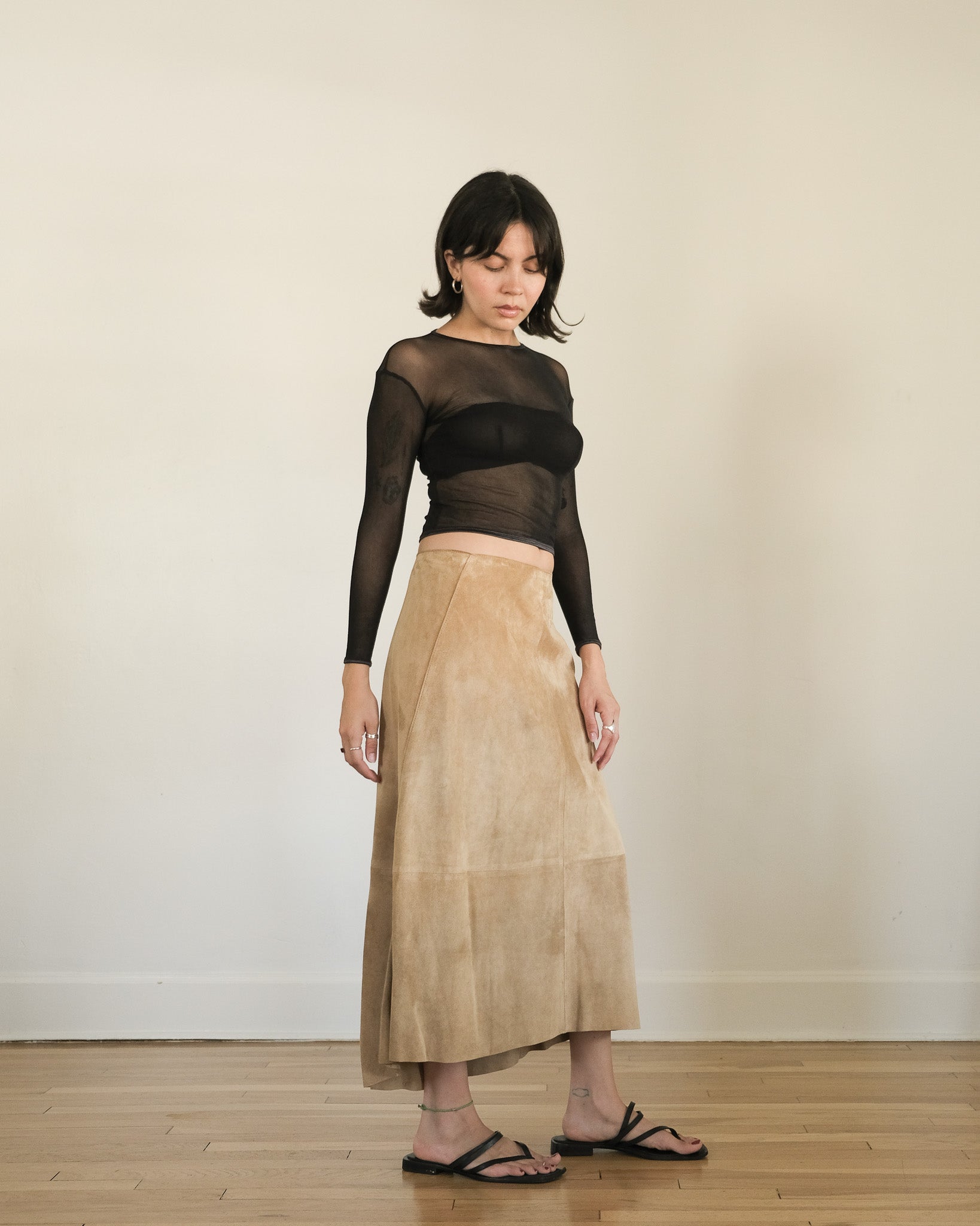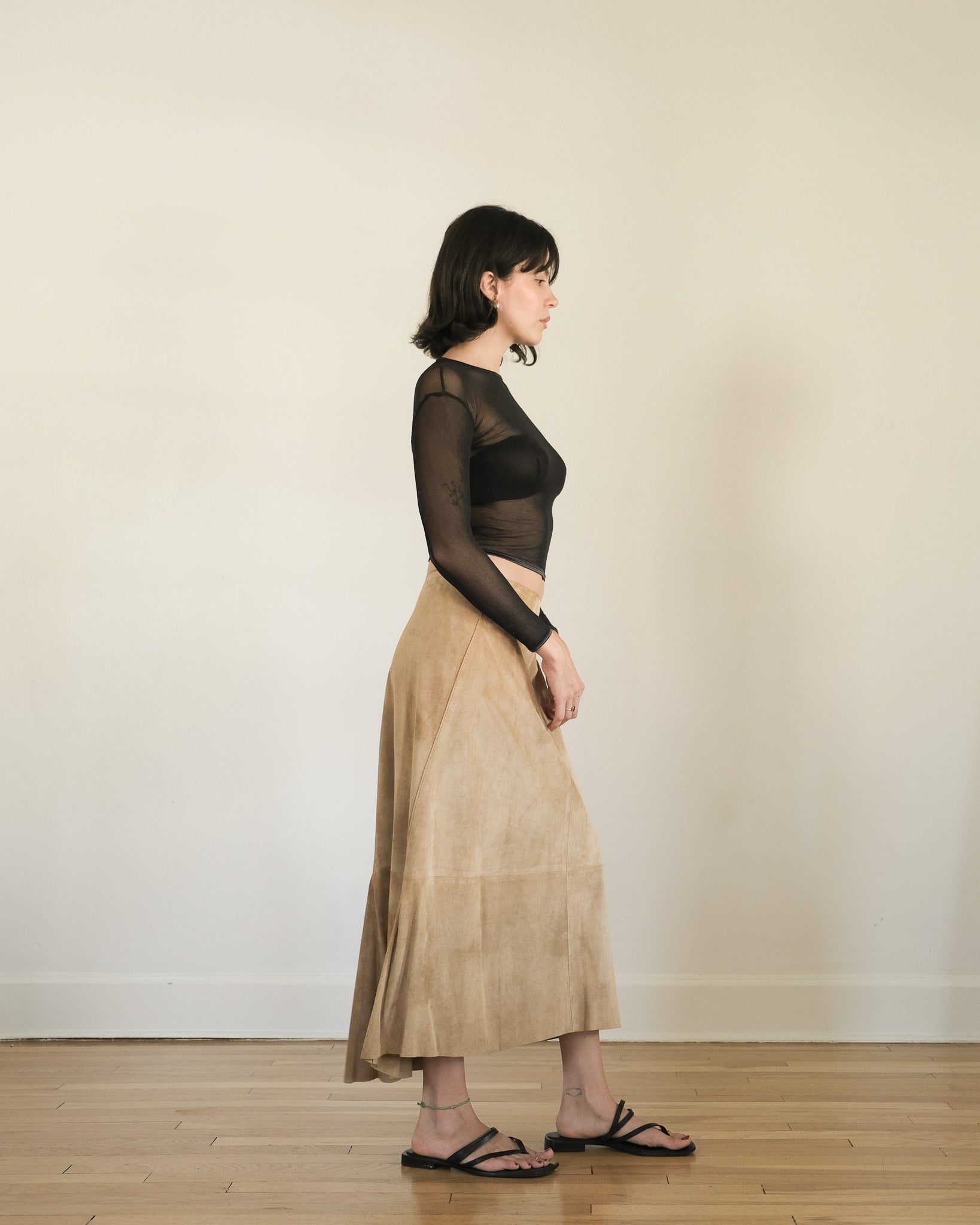 Tan suede midi skirt c. y2k DKNY. Half-lined 100% genuine suede leather, incredibly soft and supple. Mid to low rise with invisible zipper closure at back. A-line silhouette with a subtle high-low hemline.
