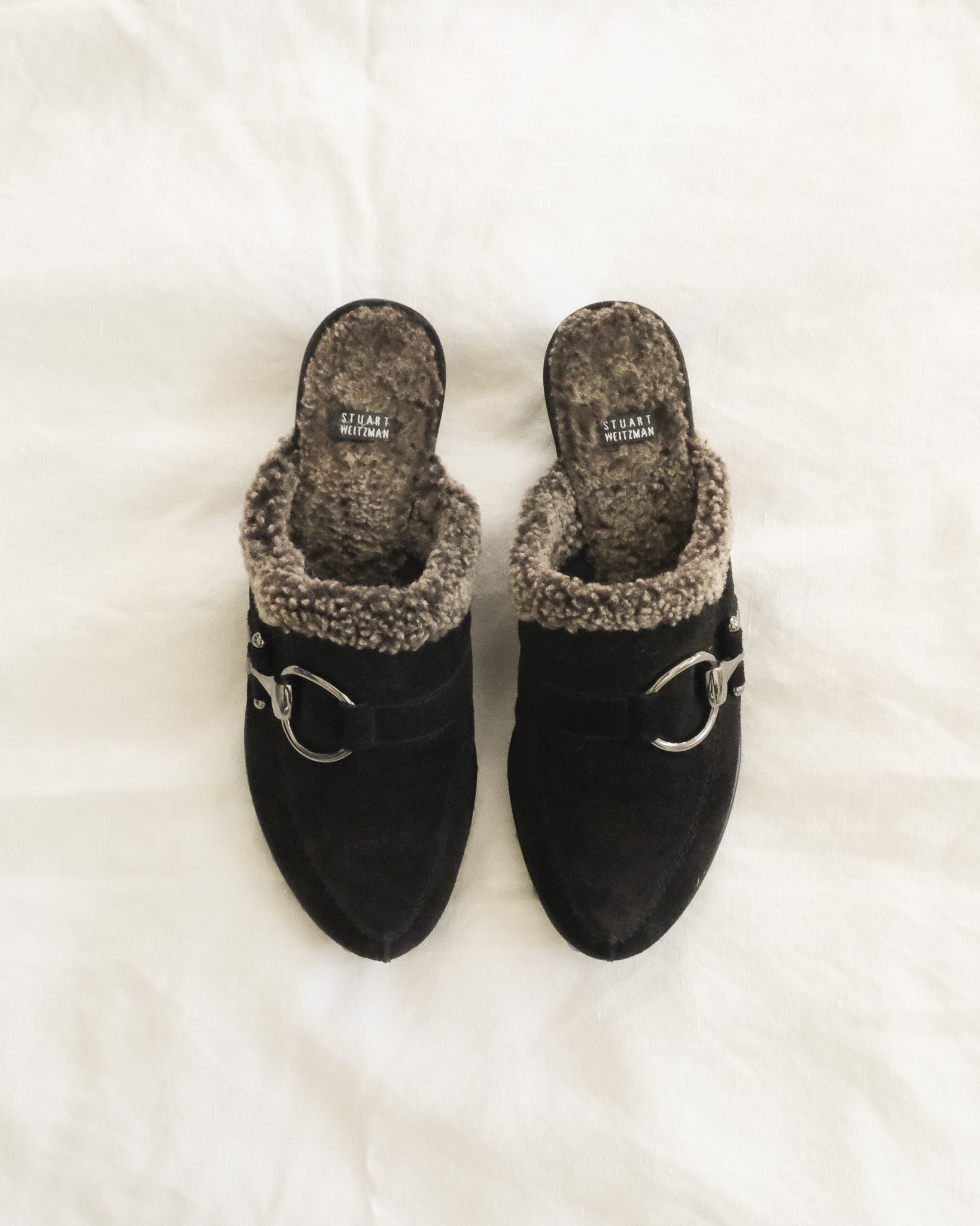 Black suede slip-on mules c. y2k Stuart Weitzman. Brown-black shearling interior and trim. Gunmetal chrome o-ring buckle and studs around sole. 2 inch wedge heel.